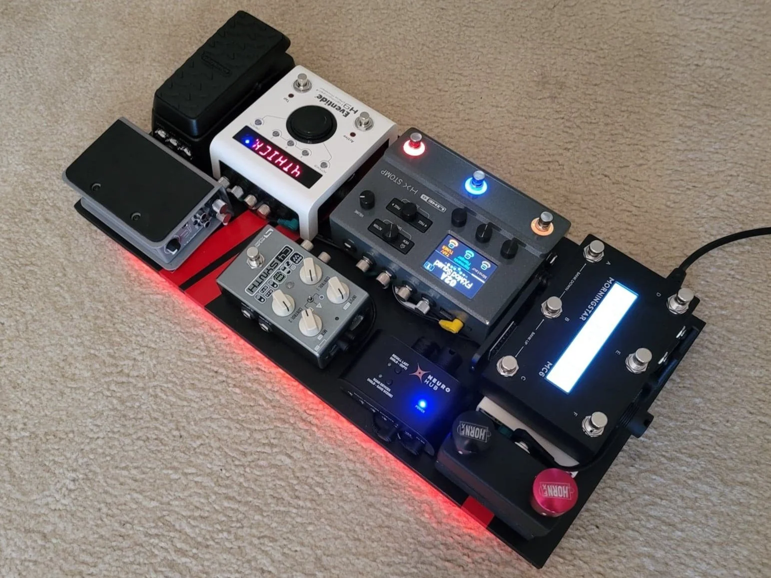 "I change my gear quite often, so below are pictures and descriptions of some of the setups ive gone through during the years. The picture to the right is one of my more recent boards. It goes like this: bassoon into Little Jake bassoon pickup that is attached to the neck (bocal) of the bassoon-that leads to a LR Baggs 9V powered preamp on the floor closest to the camera. Then-It goes into the thing on the left-a Avalon U5 direct box. Then-into the main unit that you will see in a lot of pictures because I’ve been using it since about 2012. That would be the thing with the blue light-the TC Helicon Voice Live 2. Then, I have it sent to the Boomerang Looper."